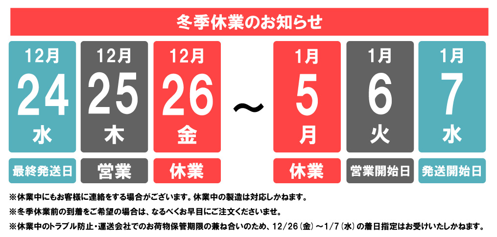 ※休業中のトラブル防止・運送会社での荷物保管期限兼ね合いのため、12/26(金)~1/7(水)の着日指定はお受けいたしかねます。