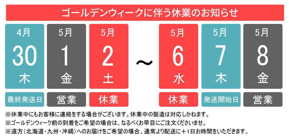 ゴールデンウイーク期間中の営業日および発送業務について、下記のとおりご案内いたします。